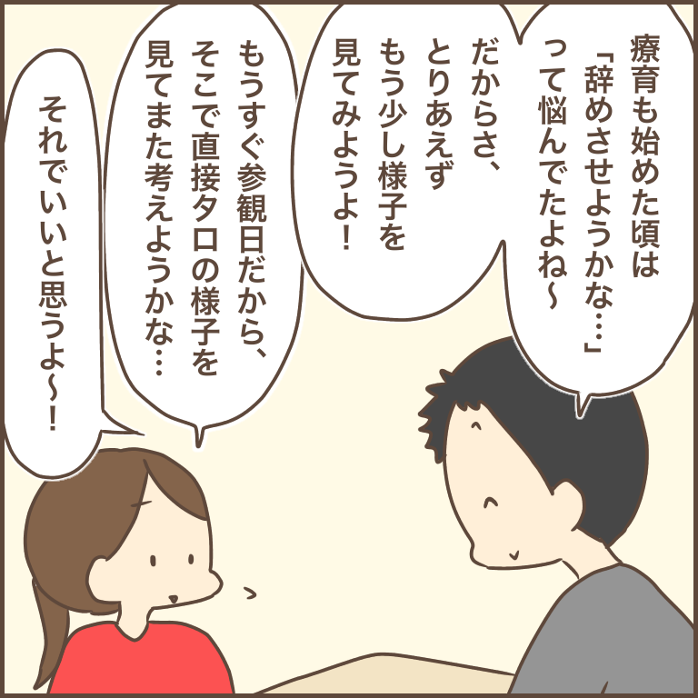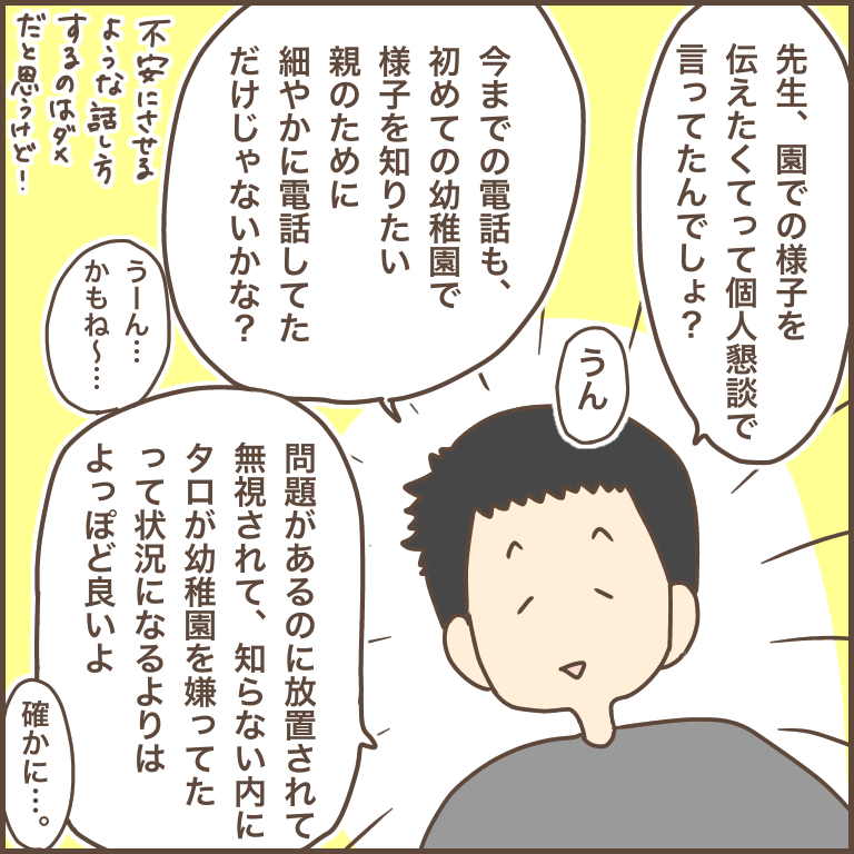 個人懇談を終えて、今後タロの幼稚園をどうするか相談すると