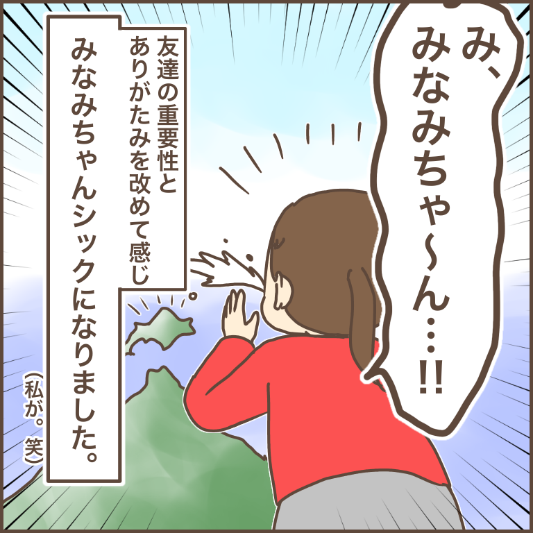 転園する前の記事にも書いていますが転勤する前から友達と離れるのはかわいそうだと思っていましたよ^^ それではやく友達ができたら、と思って引っ越し当日から同じマンションの子(幼稚園も一緒)の中で遊ばせたりしていました(これも一応記事にはしています…^^;)ただ、どの友達でもいいわけじゃなくて、積極的にタロと関わろうとしてくれるみなみちゃんのような存在が必要なのだと気付いたのです。みなみちゃんの存在は大きかったなと。話の起承転結をつけて少ないコマ数でどう書くかって難しいですね。こうやって誤解を受けることがありますので。