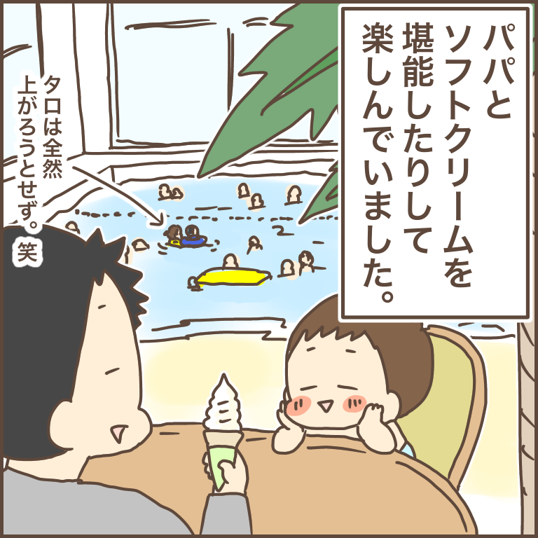 浅瀬で水遊びしたり、肌寒くなったらプール脇にあるジャグジーで温まったり、暑くなったらソフトクリームを食べたりしてパパと満喫していました。