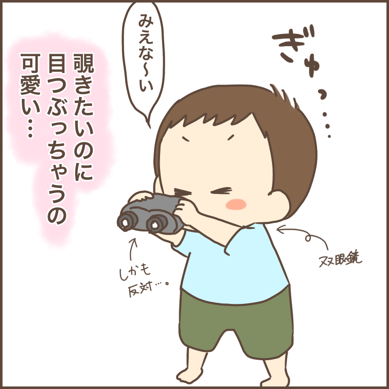大人にとって簡単な事でも、子供にとっては片眼で覗くことって難しいんですね。