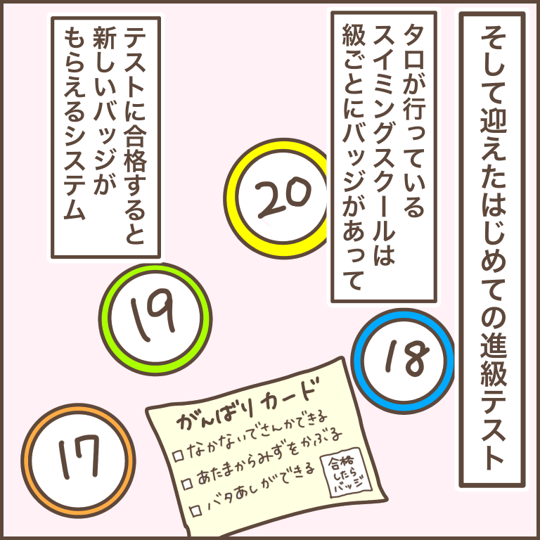顔に水がかかるのは嫌がりつつも、なんとか克服して楽しくスイミングに通うタロ。
