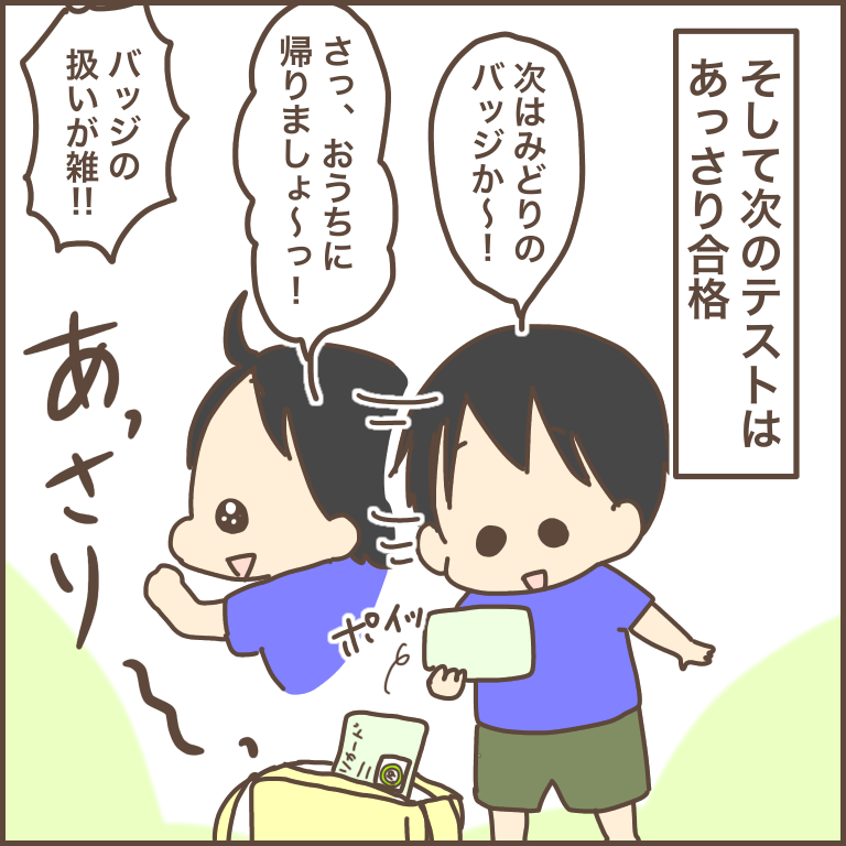 何度も「今日テスト?」「新しいバッジ何色かな?」「バッジもらえるかな?」と言ってテストを楽しみにしている様子だったのに、いざ合格してしまうとあっさり〜