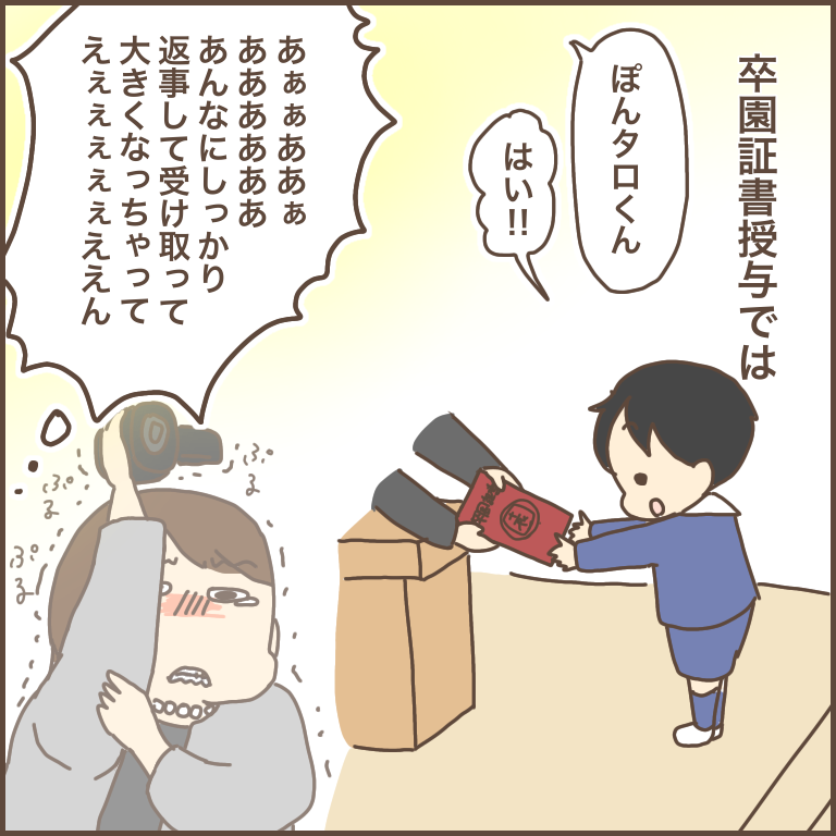うちも上の子が卒園でした。涙なしの参列は、、、無理ですよね!!腕のプルプルもめっちゃ分かります!他の方のカメラとか腕とか頭とか、、、まだ小さな園児の顔を捉えようとすると必ず写り込んでくるので、高さや角度を維持するのために必死でした(笑)