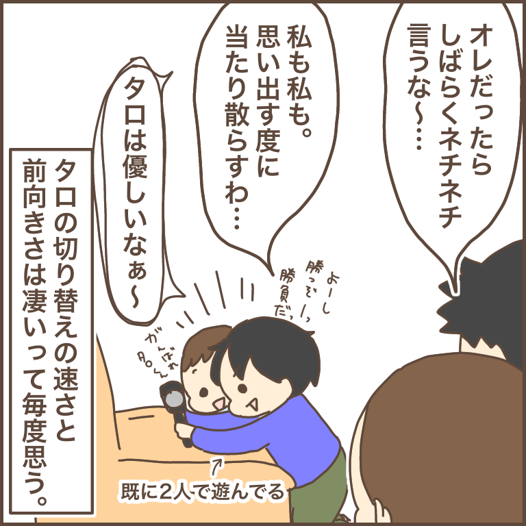 他の皆さまもおっしゃられている通り、タロくんの切り替えの早さや寛大さは、大人から見ても本当にすごいことですし、見習わなくてはな〜と感じました!