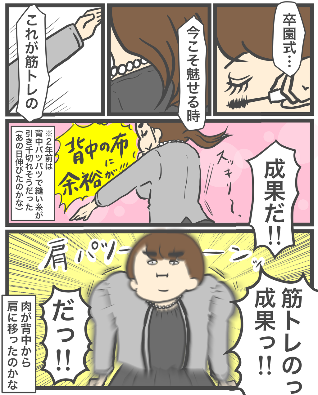 ぽんぽんさん、肉じゃがハピネスのとき体重増えたってお話してましたが、筋トレ効果すごいですね(^^)背中すっきり!でも肩がっちりに笑いました(笑)