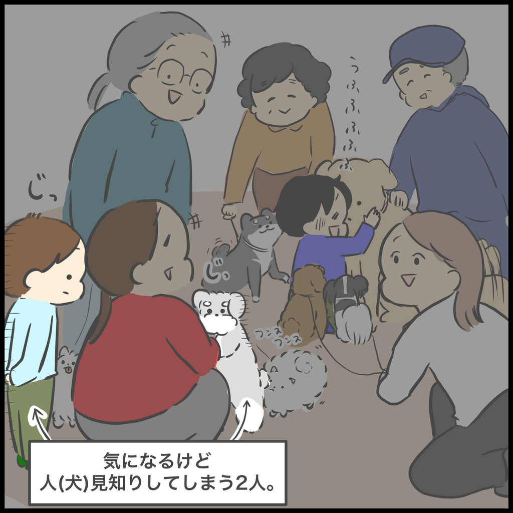 本当は交流したいけどどうしていいか分からず固まってしまうジロとマロ(犬)