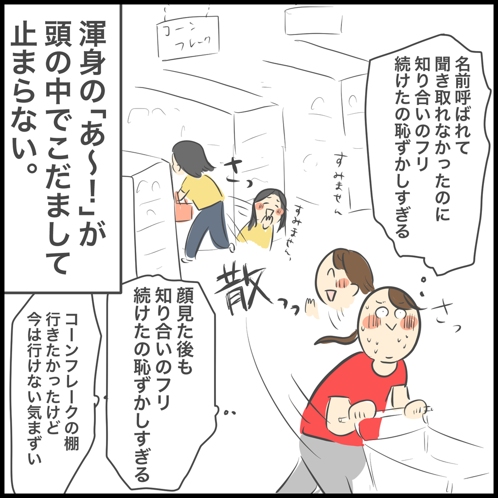 気まずすぎて店の中で鉢合わせないように姿を見かけては横の棚に入り込み、レジ列も遠く離し、最後まで避けてスーパーを後にしました。