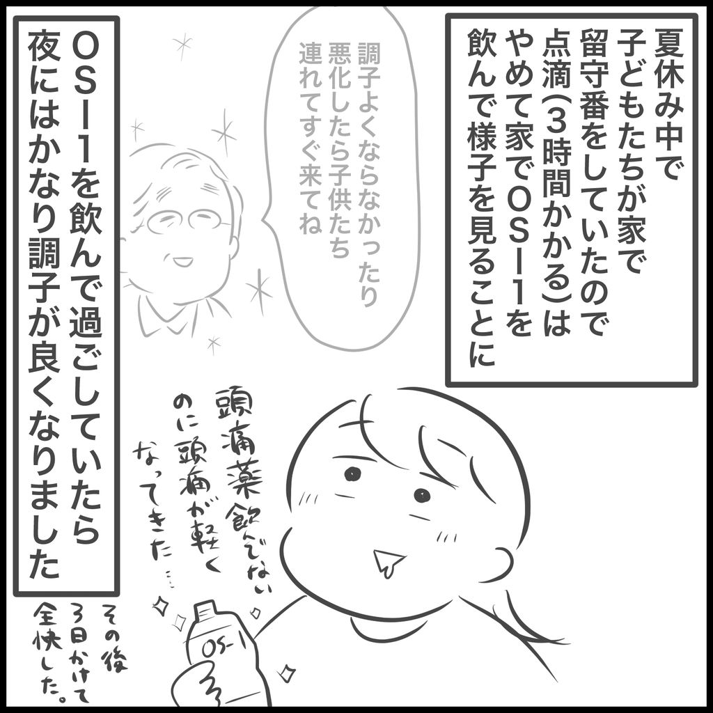 点滴をする時間がない…と頭を抱えているととりあえずOSー1を買って飲みなさいと言われ、その通りにしていると夜には大分ラクになりました。