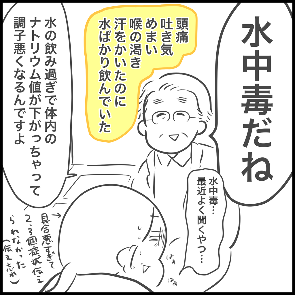 頭痛と吐き気とめまいがある中で先生の話を聞いていたため聞き違い・聞き漏らし・詳しく聞けなかった等々あるので私の話が水中毒の全てとは思わないでほしいのですが