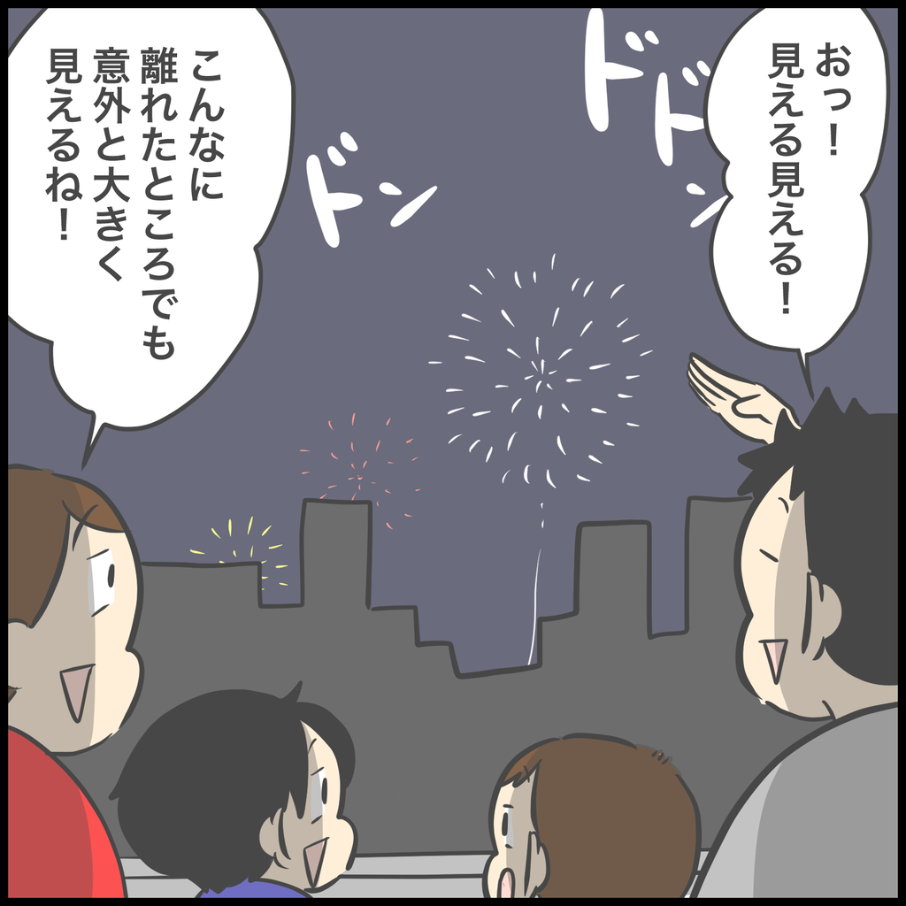 低い位置で上がる花火はほとんど見えなかったけど、高い位置で広がる大きな花火はバッチリ見られたので子供たちも目を輝かせていましたよ!