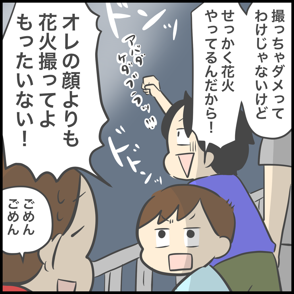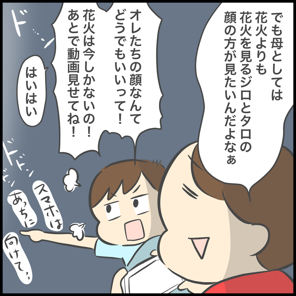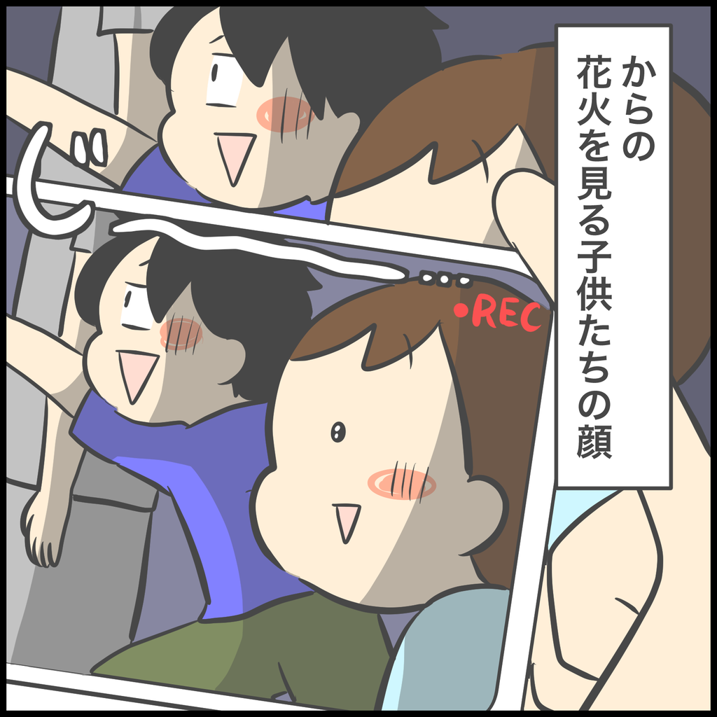 真下で大迫力の花火が見たくて(見せたくて)前日まで会場に行くか行かないかを悩みましたが、混んでいない場所で見ていたので子供たちは花火の合間にちょっと体を動かすこともできたし、花火が終わったらすぐに退散できて、渋滞や人混みに流されることもなく家のお風呂に直行できたのは良かった点でした。