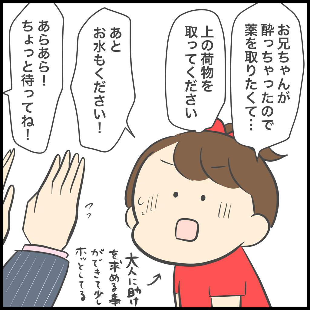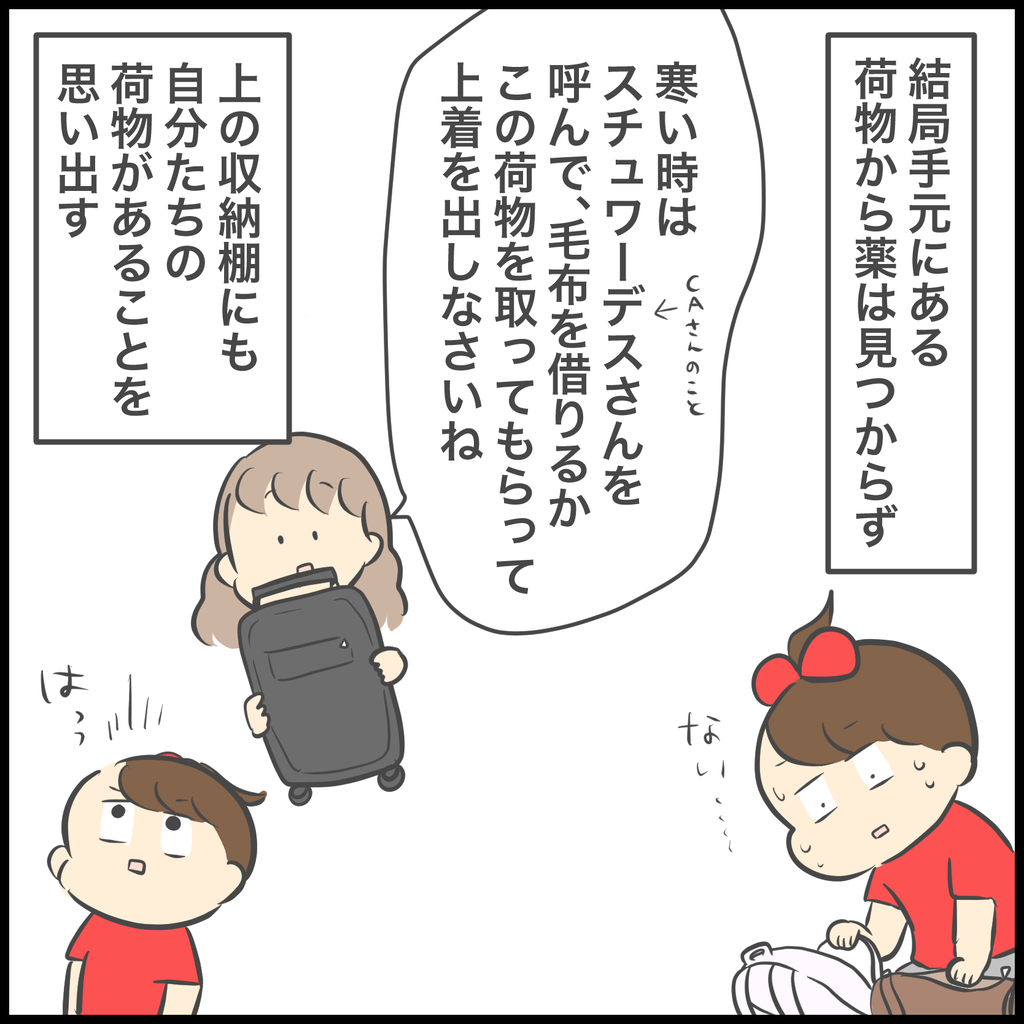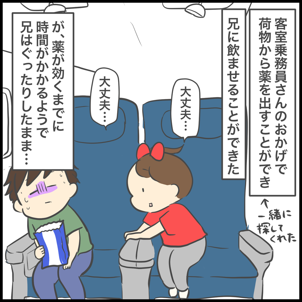 客室乗務員さんの助けを借りてどうにか薬を探し出し、飲ませることができて一安心しましたが