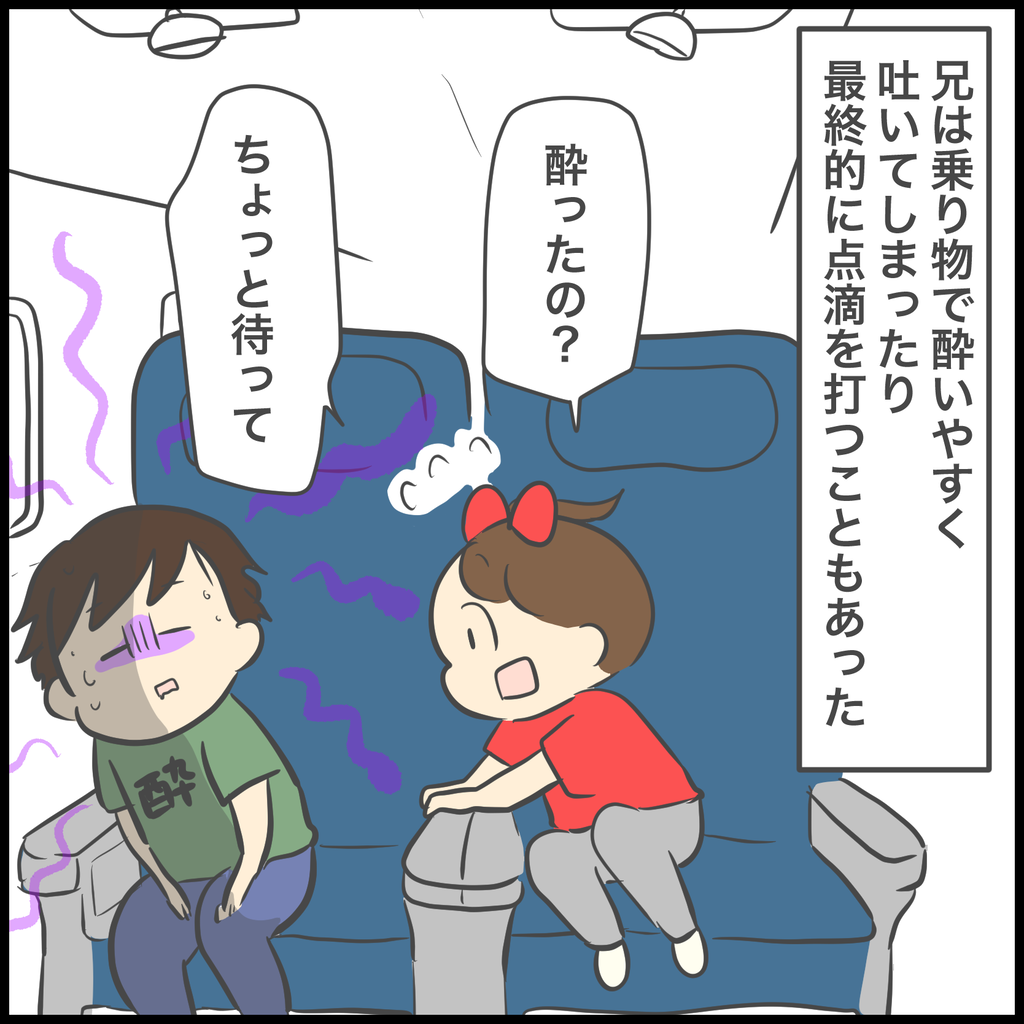 兄は小さい頃酔いやすくて、遠出した後家に帰る前に小児科に寄って点滴をしてもらったこともあるほど酷い酔い方をしていました。(吐きすぎて脱水状態になったのかな…?なんの点滴だったんだろう)