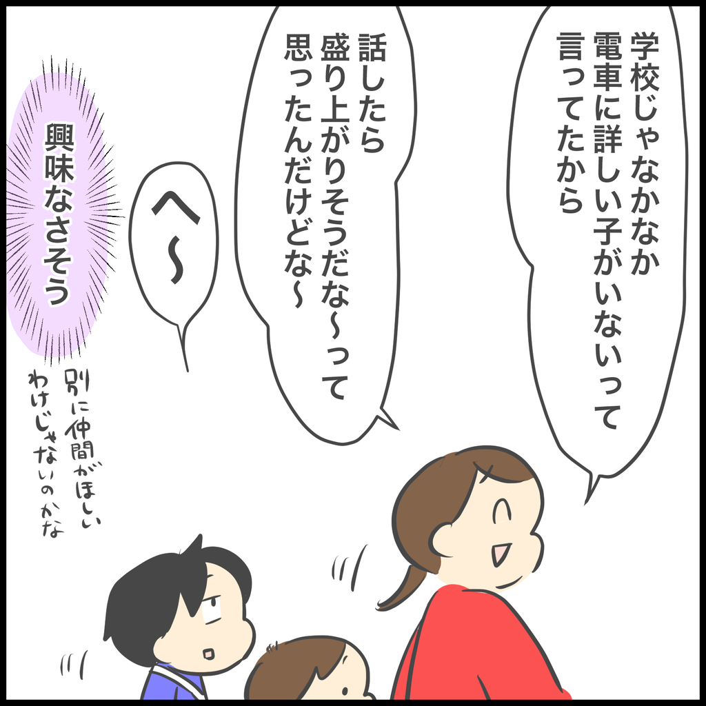 学校にも電車や新幹線が好きな子はちらほらいるそうですが、マニアックすぎる話はできないみたいだし、私が頑張って答えようにも電車の知識は何もないしで(よく乗り間違えるしね)