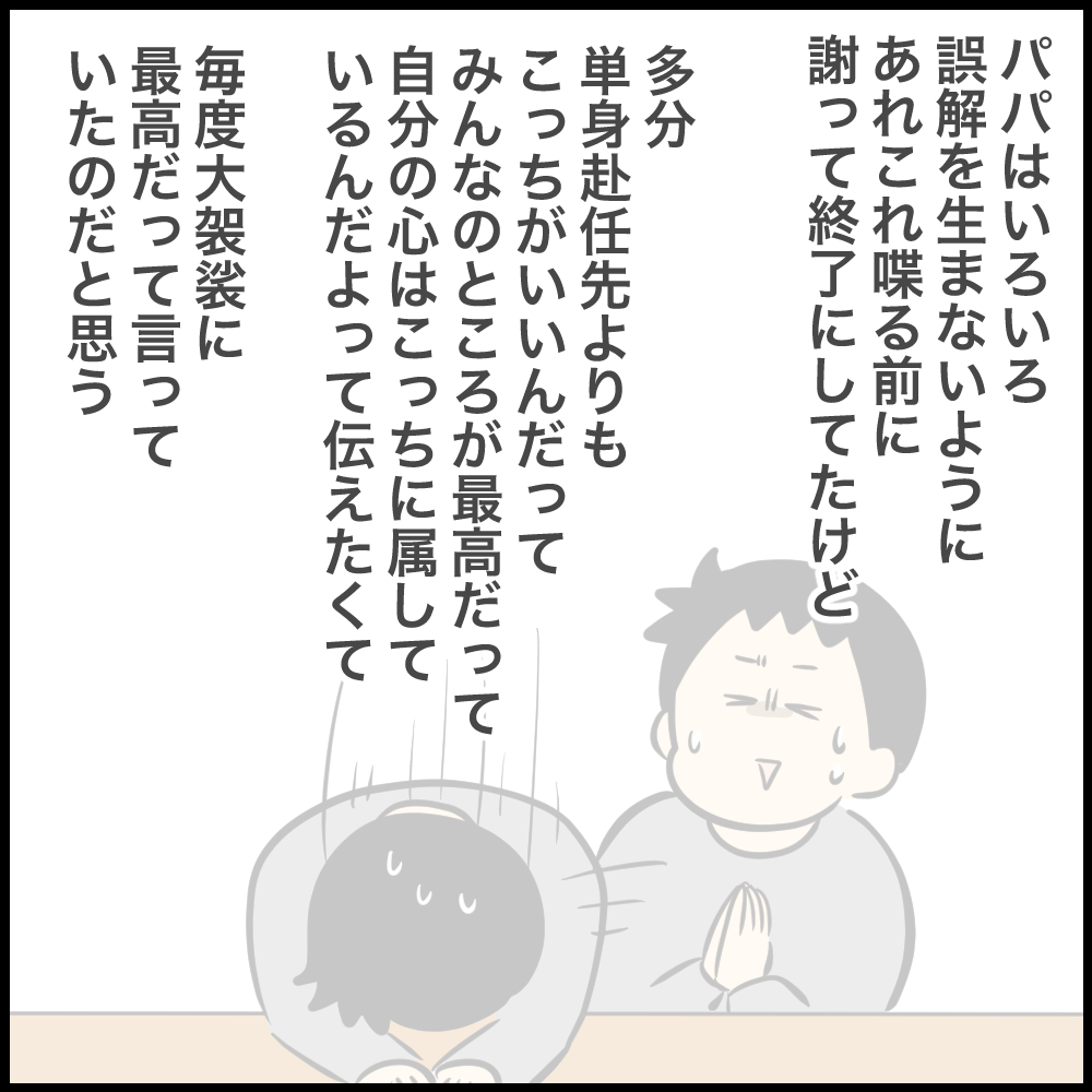 わたしも10年ほど前、主人が単身赴任していました。当時を思い出して、自分を重ねて読んでしまい、涙が出ましたー( ; ; )