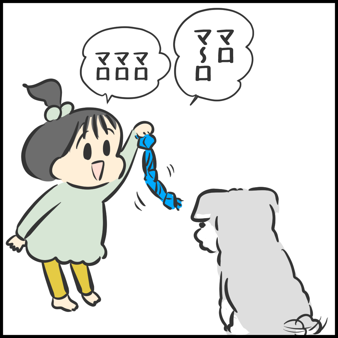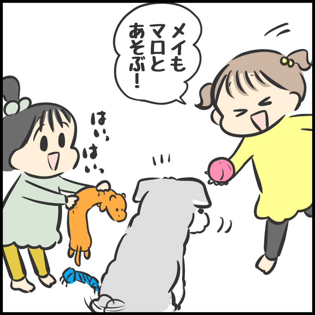 そして今度は犬のおもちゃで遊びたい姪っ子たちがマロにグイグイ行きだしたんだけど