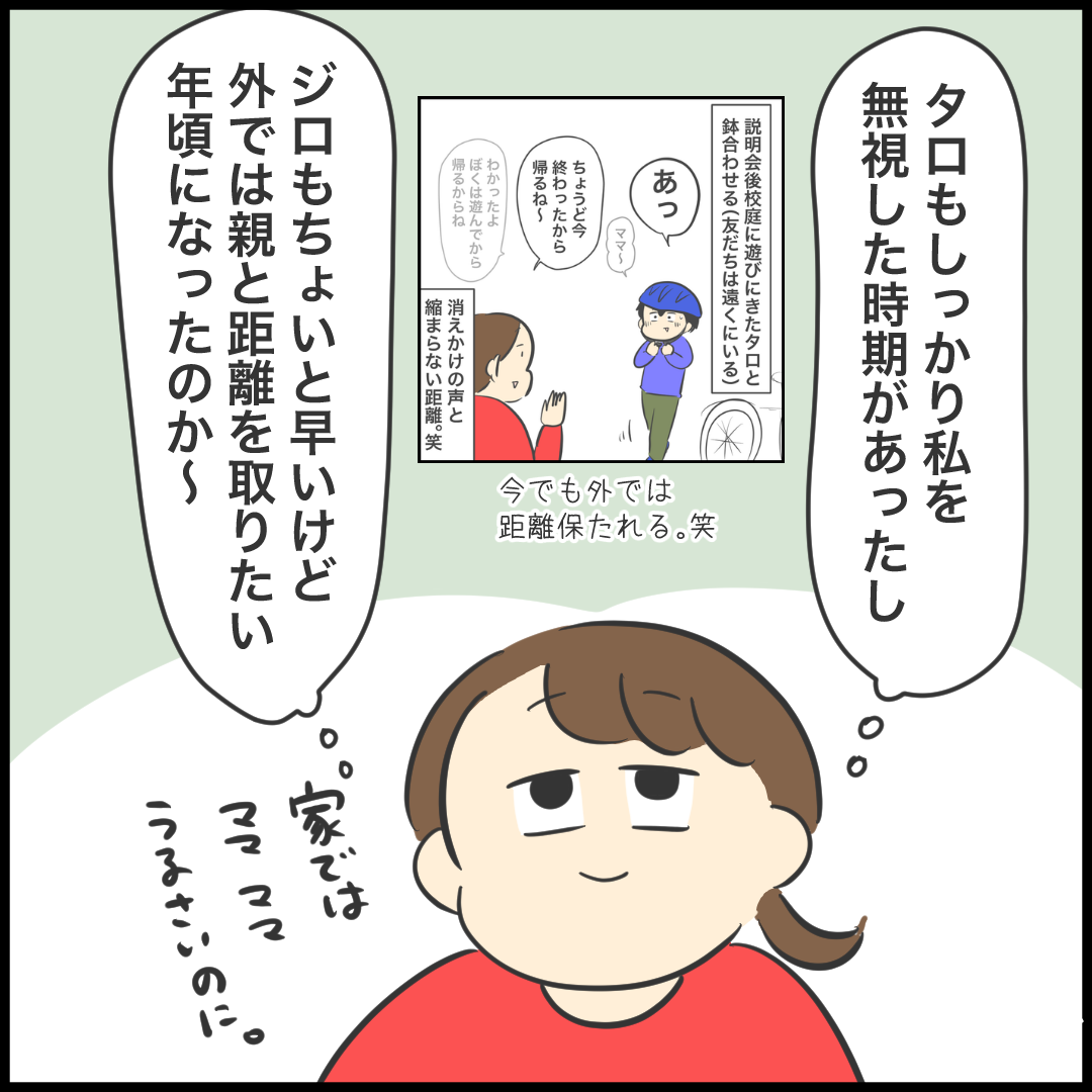 男の子だし、お母さんとベタベタというよりは、あっさりいい距離感でいたいなって思っているので無視も歓迎!外での冷たい態度もOK!!って思っているけど